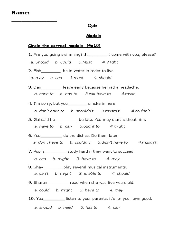 All worksheets only my followed users only my favourite worksheets only my own worksheets. Complete the following exercise with past modal verbs. 5 complete the sentences with the modal verbs in the list. Free online tutorial focusing on modal verbs and modal like expressions with interactive modal verb exercises. Go to the football match, but he. Click on the thumbnail preview to view the full worksheet. Have to can mustn't e must can e might can't e might not don't have to. Some answers may be used more than once. He can play the guitar very well. All downloads are in pdf format and consist of a worksheet and answer sheet to check your results. Look at the worksheet and the description and decide which one to print. These worksheets will help you review how and when to use modal verbs. Modal verbs of possibility and certainty esl games, activities and worksheets to help students learn how to express modals of possibility and certainty esl games, activities and worksheets.